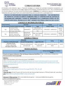 PROCESO DE PARTICIPACIÓN CIUDADANA PARA LA CONSULTA AMBIENTAL- FASE INFORMATIVA DEL PROYECTO: ESTUDIO DE IMPACTO AMBIENTAL PARA LA “CONSTRUCCIÓN DEL SISTEMA DE ALCANTARILLADO SANITARIO Y PLANTA DE TRATAMIENTO DE LA APRROQUIA PUERTO JELÍ DEL CANTÓN SANTA ROSA, PROVINCIA DE EL ORO”, signado con código: MAAE-RA-2021-415437.